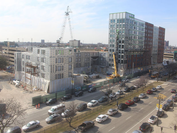 Structure - multi-phase project with three separate buildings comprised of 7, 10, and 5 story buildings on top of a structural steel podium deck